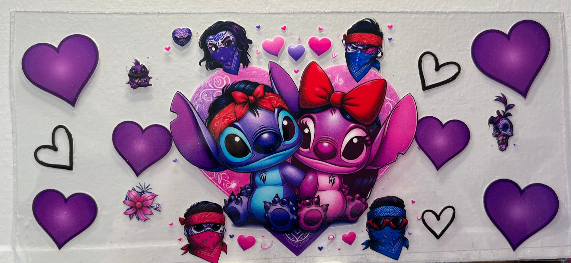 16oz UV DTF Wraps for Children's Drink Bottles or Snow Globes - Stitch and Angle with Purple hearts