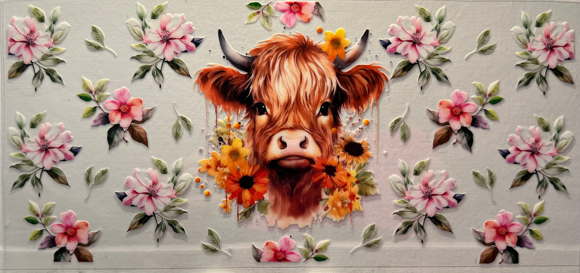 16oz UV DTF Wraps for Children's Drink Bottles or Snow Globes - Highland Cow, Pink Flowers